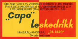 Original Capo og moderinsert versjon. (Foto original Capo: Janis Steensen)Etikettdesign og retro plakater for «Capo». En leskedrikk som ble produsert på en brusfabrikk i Skudenes frem til 1995. I 2018 fikk den nytt liv av Skuenes Bryggeri. Etiketten tar vare på den originale identiteten, men har fått en modernisert form. I tillegg er det utviklet en ny etikett for en kullsyreholdig versjon. I tillegg har vi laget retro plakater i samme ånd.
