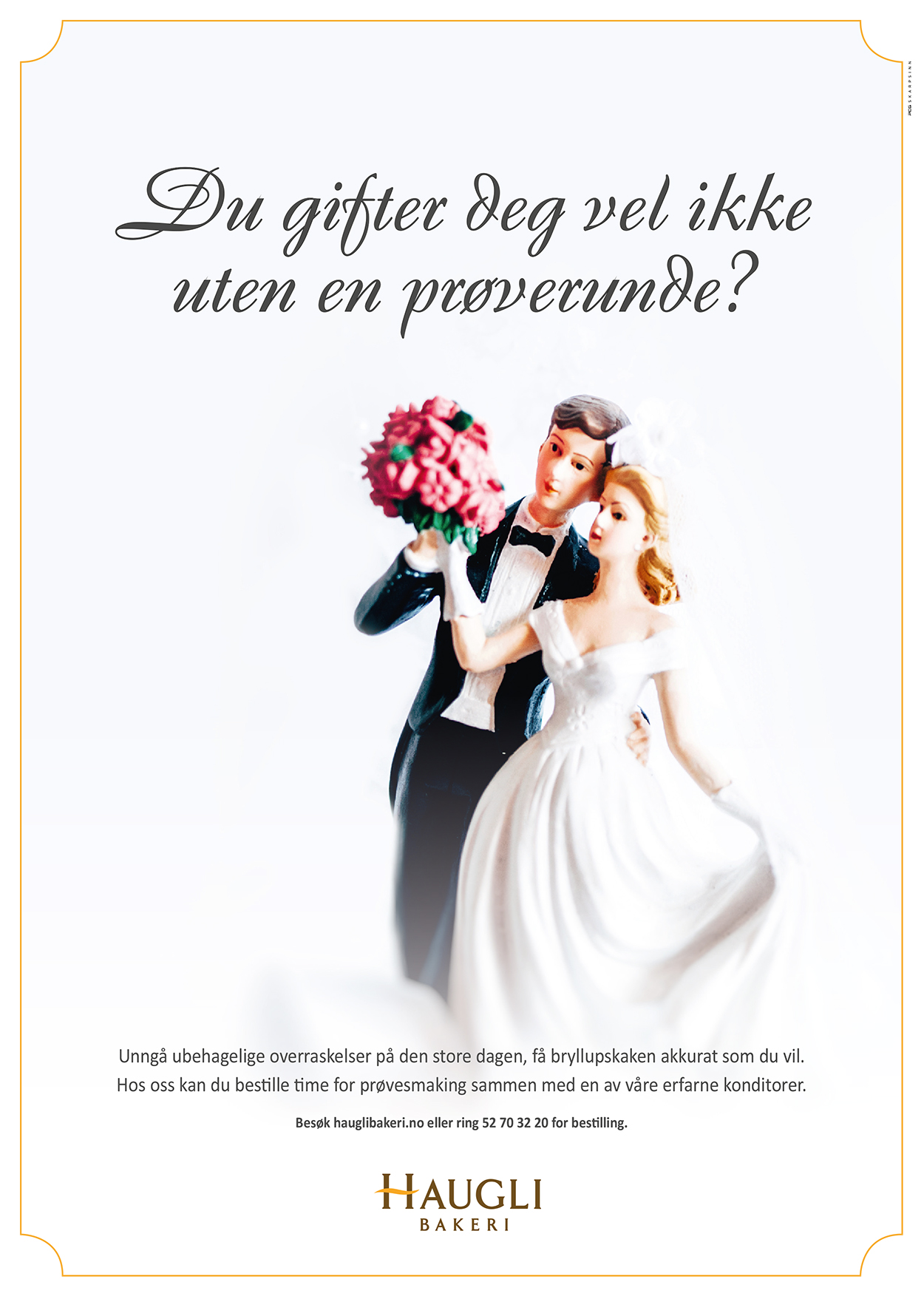 Annonse for Haugli Bakeri som setter fokus på at de kan tilby prøvesmaking av bryllupskaker.
