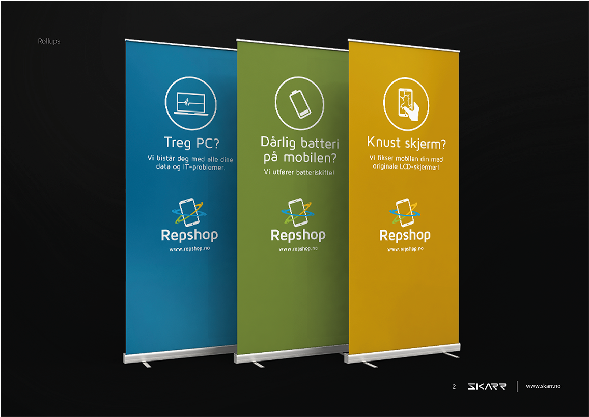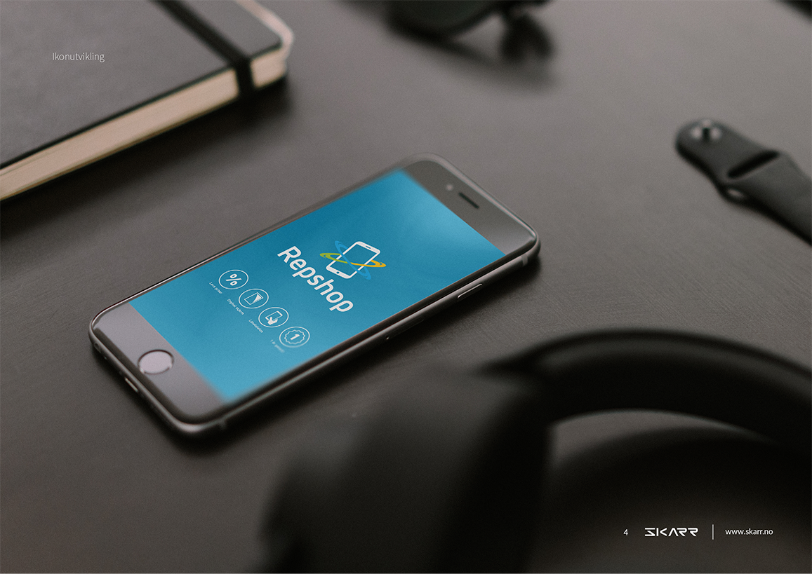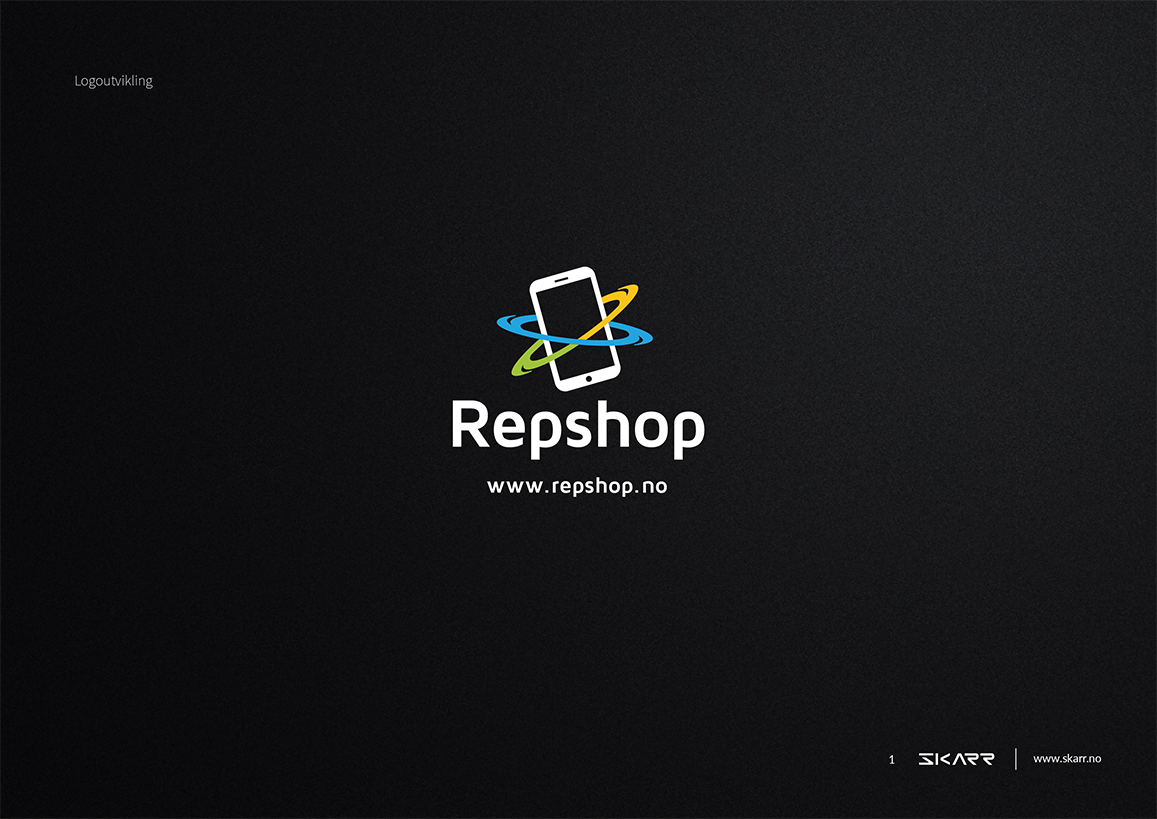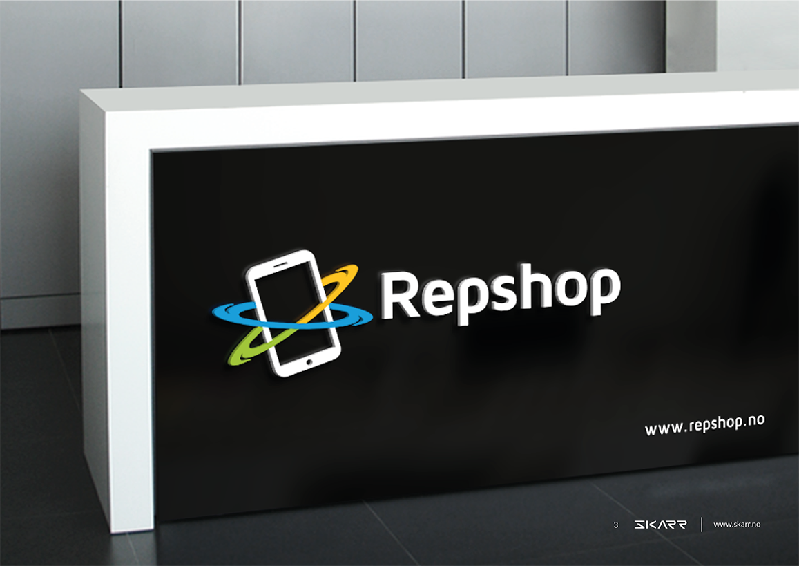 Logo og profilarbeid for Repshop. Repshop holder til på Oasen Storsenter og reparerer blant annet knuste skjermer på telefoner.