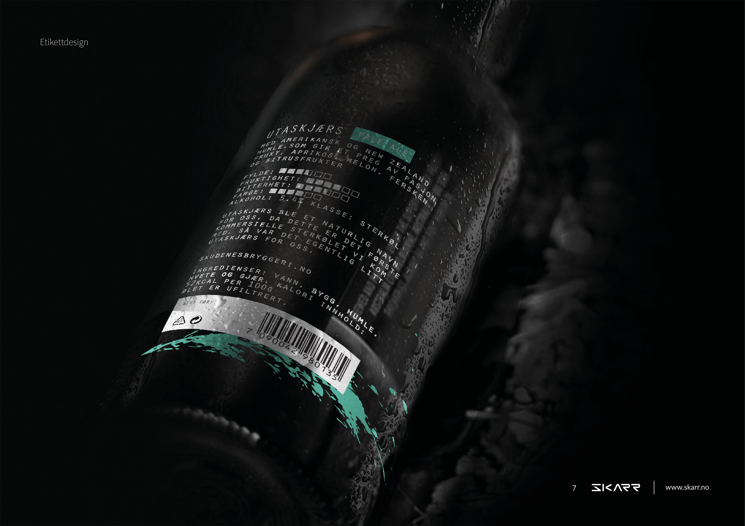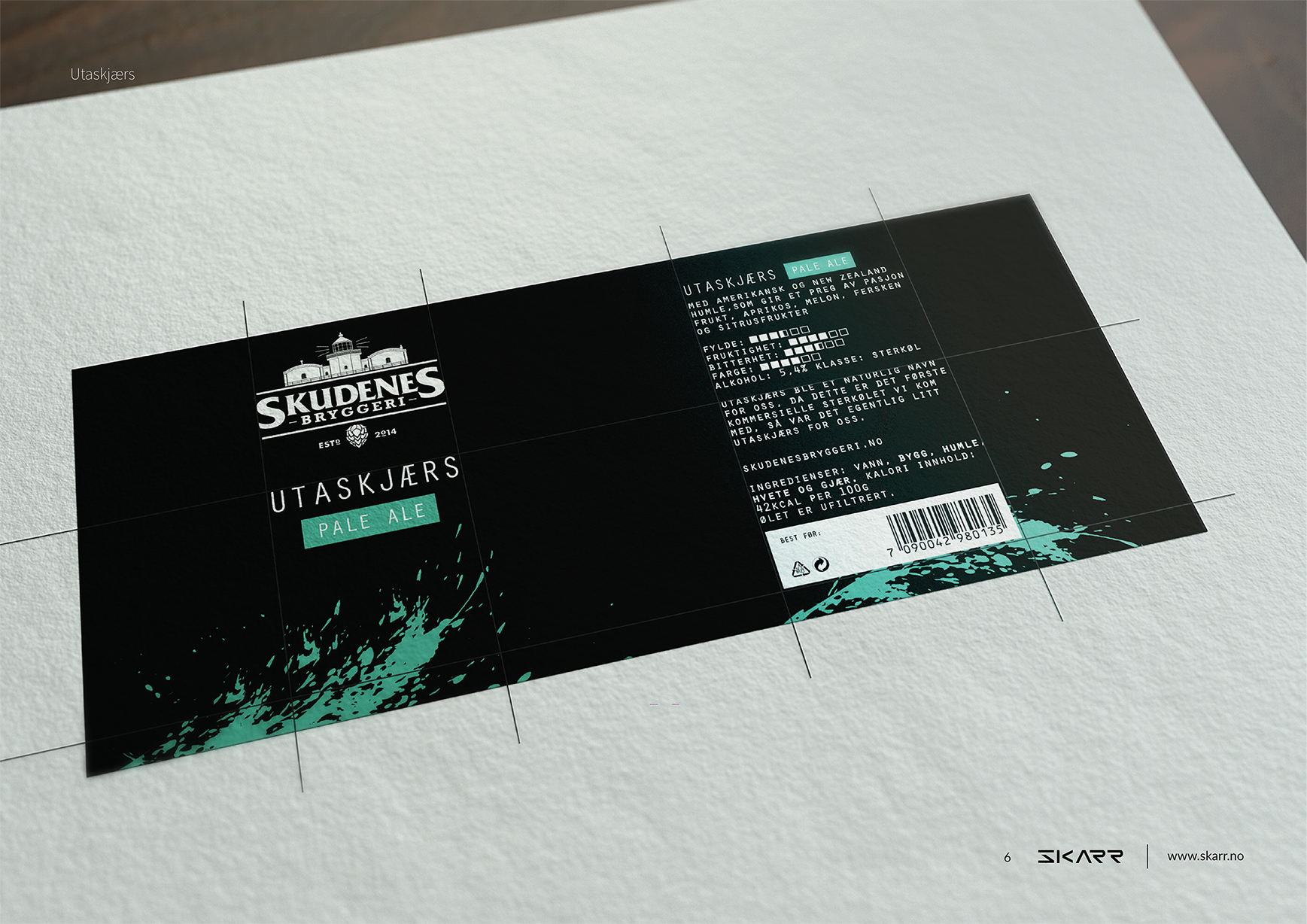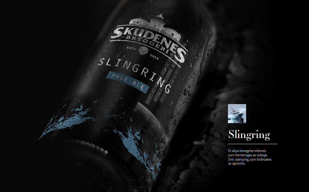 Design og tekstarbeid for Skudenes Bryggeris sterkølserie. Skudenes Bryggeri skulle ut med en ny sterkølserie. De ønsket ny etikettdesign fire øltyper samt forslag til navn. Vi ønsket og ta vare på den maritime profilen til Skudenes Bryggeri, samtidig gjøre noe nytt og spennende med flaskene. Vi fant jobbet frem sterke maritime navn til øltypene og en egen grafisk tekstur som linkes til navnet. Alle ølene fikk sin egen fargepalett etter type og fylde.